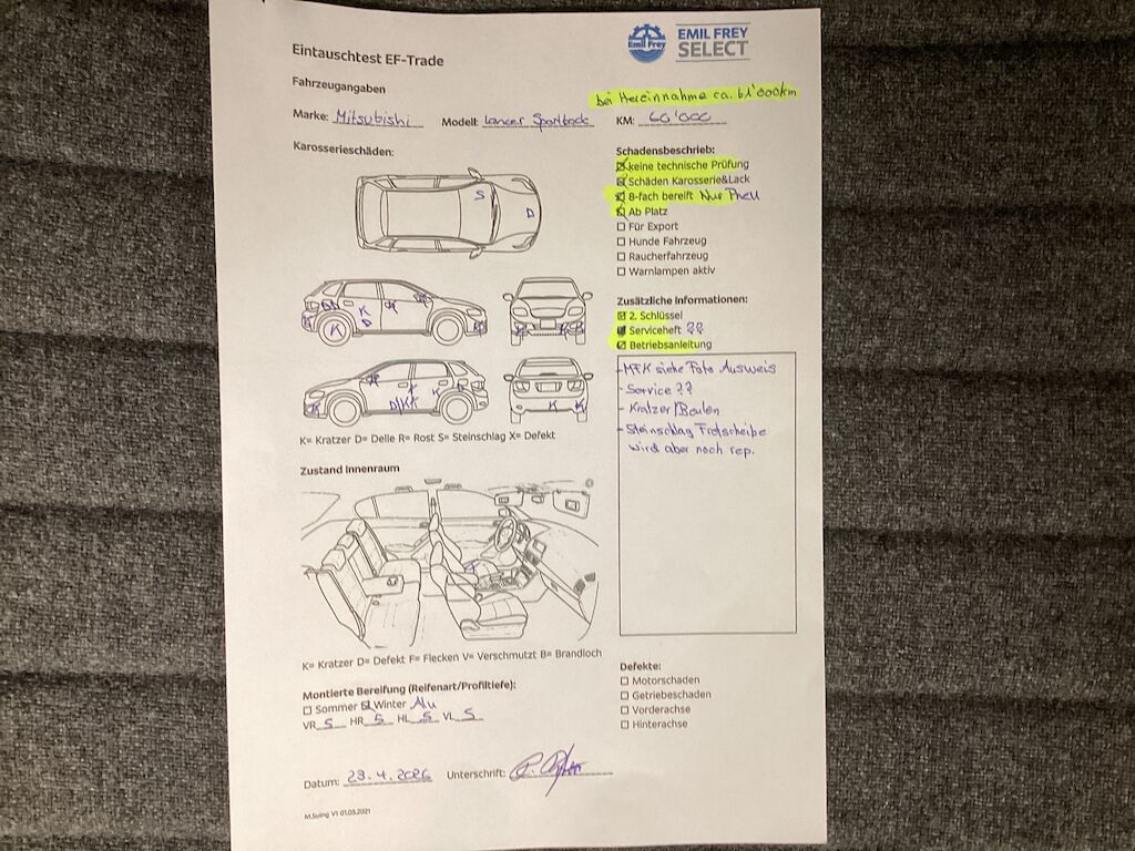 | MFK siehe Foto Ausweis Service ??? Kratzer und Beulen Steinschlag Frontscheibe wird noch durch Kunde rep. Kilometerstand bei Hereinnahme Datum ca 61000km |
